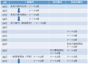 先行案内の重要性、メールを毎日送ること、それぞれの内容など、パッとは伝えきれない重要なマーケティング戦術が、このメールスケジュールの中にかなり多く詰め込まれています。